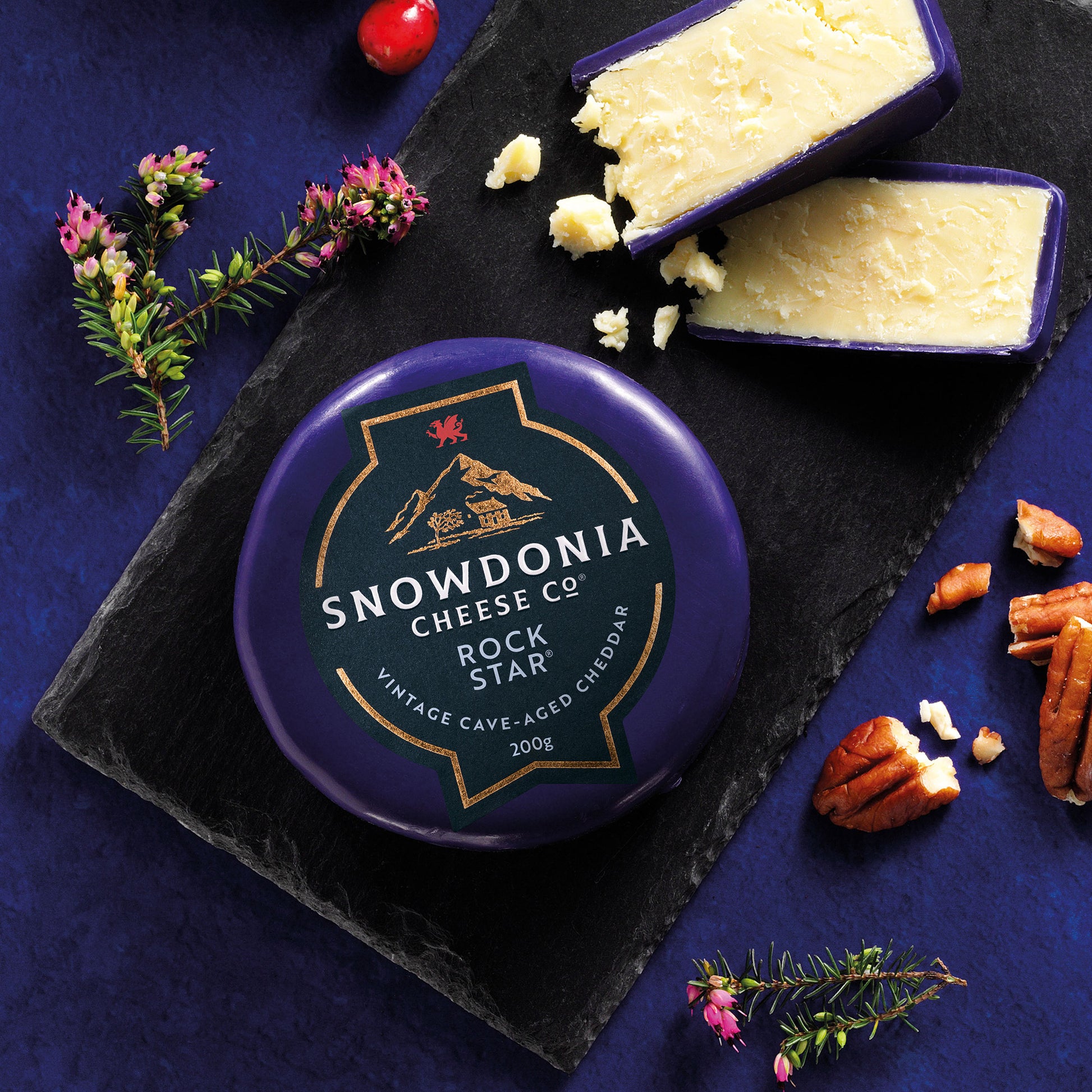 Rock Star Cheese - Rock Star, our debut vintage cave-aged Cheddar, completes its 18-month maturation inside Welsh slate caverns surrounded by the mountains of Snowdonia. With a hint of sweetness and a long savoury tang, Rock Star’s complex flavours are as deep as the historical caverns it’s aged in. Smooth and creamy, with the occasional crystal crunch. Sealed in a slate-blue wax. And the undisputed star of your cheeseboard. 200g
